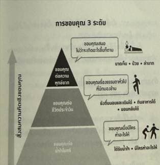 ผู้เขียนยังแบ่งการขอบคุณออกเป็น 3 ระดับ ระดับแรก คือ การขอบคุณต่อน้ำใจไมตรี เป็นการขอบคุณเมื่อมีใครสักคนทำสิ่งดี ๆ ให้กับเรา ระดับที่สอง คือ การขอบคุณต่อชีวิตประจำวัน