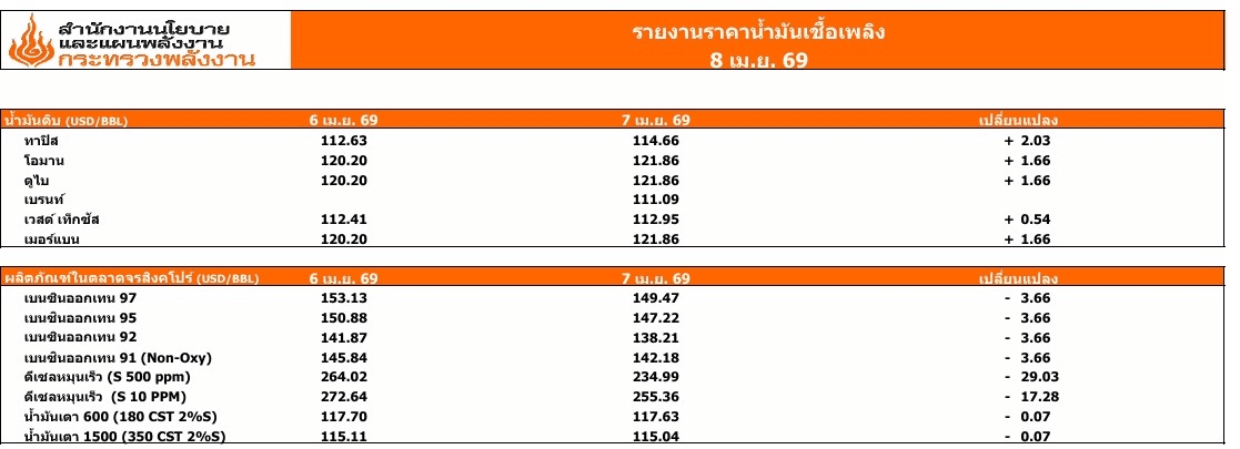 โดยเมื่อวันที่ 7 เมษายน ราคาลดลงทุกชนิดจากราคาเมื่อวันที่ 6 เมษายน เช่น เบนซิน 97 อยู่ที่ 149.47 เหรียญสหรัฐ/บาร์เรล ลดลง 3.66 เหรียญสหรัฐ, เบนซิน 95 อยู่ที่ 147.22 เหรียญสหรัฐ/บาร์เรล ลดลง 3.66 เหรียญสหรัฐ, เบนซิน 92 อยู่ที่ 138.21 เหรียญสหรัฐ/บาร์เรล ลดลง 3.66 เหรียญสหรัฐ, เบนซิน 91 อยู่ที่ 142.18 เหรียญสหรัฐ/บาร์เรล ลดลง 3.66 เหรียญสหรัฐ, ดีเซลหมุนเร็ว(s 500 ppm) อยู่ที่ 234.99 เหรียญสหรัฐ/บาร์เรล ลดลงถึง 29.03 เหรียญสหรัฐ, ดีเซลหมุนเร็ว (s 10 ppm) อยู่ที่ 255.36 เหรียญสหรัฐ/บาร์เรล ลดลง17.28 เหรียญสหรัฐ