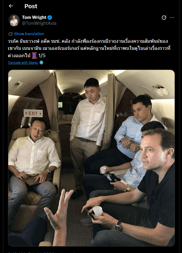 โดยนายทอม ไรต์ อ้างว่านายเบนจามิน เมาเออร์เบอร์เกอร์ หรือว่าเบน สมิธ นักธุรกิจชาวต่างชาติที่ถูกสำนักงานป้องกันและปราบปรามการฟอกเงิน (ปปง.) ออกคำสั่งอายัดเงิน เนื่องจากข้อครหาว่าเกี่ยวข้องกับสแกมเมอร์นั้นมีส่วนเกี่ยวข้องกับการลงทุนที่นครดูไบ สหรัฐอาหรับเอมิเรตส์หรือ UAE เนื่องจากปรากฎข้อมูลว่ามีบริษัทลงทุนในดูไบแห่งหนึ่งชื่อว่าบริษัท โซเวอเรน แคปิตอล ลิมิเต็ด (Sovereign Capital Limited) นั้นมีผู้ก่อตั้งบริษัท 3 คนประกอบไปด้วย