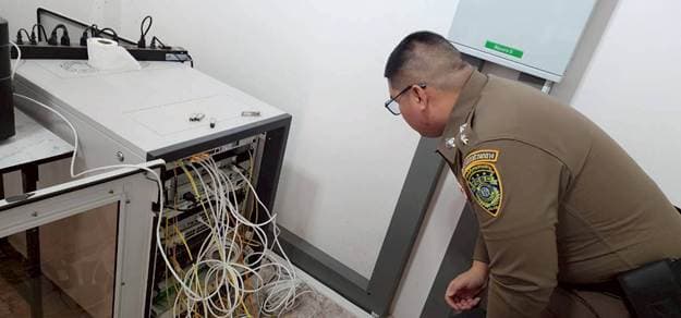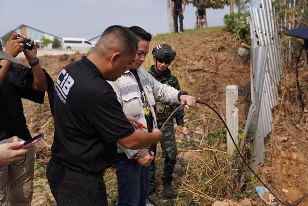 ที่สำคัญ เจ้าหน้าที่ยังตรวจพบการเดินสายสัญญาณอินเทอร์เน็ตความเร็วสูง (Fiber Optic) ที่ถูกบรรจุในท่อ PVC และฝังใต้ดินลึกกว่า 2 เมตร โดยสายสัญญาณดังกล่าวถูกลากเชื่อมต่อไปยังพื้นที่ของประเทศเมียนมา ซึ่งเป็นหลักฐานสำคัญที่ทำให้เจ้าหน้าที่เชื่อว่า มีการลักลอบนำสัญญาณอินเทอร์เน็ตที่ได้รับอนุญาตให้ใช้ภายในประเทศไทย ส่งต่อไปใช้งานในต่างประเทศโดยผิดกฎหมาย