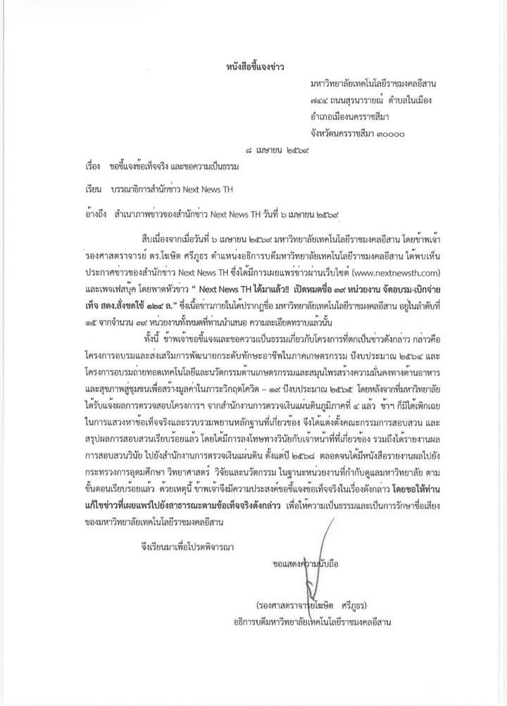 สำนักข่าว Next News รายงานว่าเมื่อวันที่ 8 เมษายน 2569 รองศาสตราจารย์ ดร.โฆษิต ศรีภูธร อธิการบดีมหาวิทยาลัยเทคโนโลยีราชมงคลอีสาน (มทร.อีสาน) ได้ออกหนังสือชี้แจงข่าวถึงบรรณาธิการสำนักข่าว Next News TH เพื่อขอชี้แจงข้อเท็จจริงและขอความเป็นธรรม กรณีที่สำนักข่าวได้เผยแพร่ข่าวเมื่อวันที่ 6 เมษายน 2569 พาดหัวข่าว “Next News TH ได้มาแล้ว!! เปิดหมดชื่อ 39 หน่วยงาน จัดอบรม-เบิกจ่าย เท็จ สตง.สั่งชดใช้ 124 ล.” ซึ่งระบุชื่อ มทร.อีสาน อยู่ในลำดับที่ 15 ของหน่วยงานที่ถูกกล่าวถึง