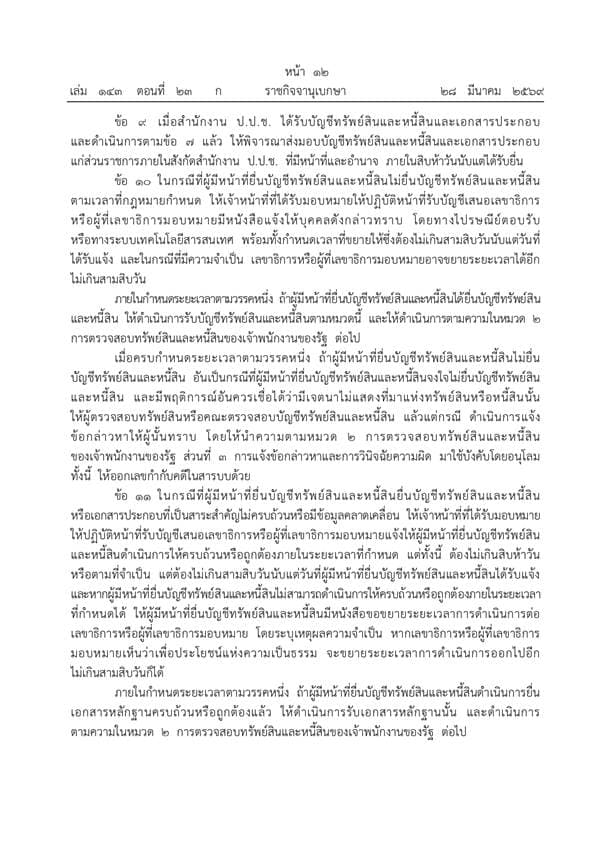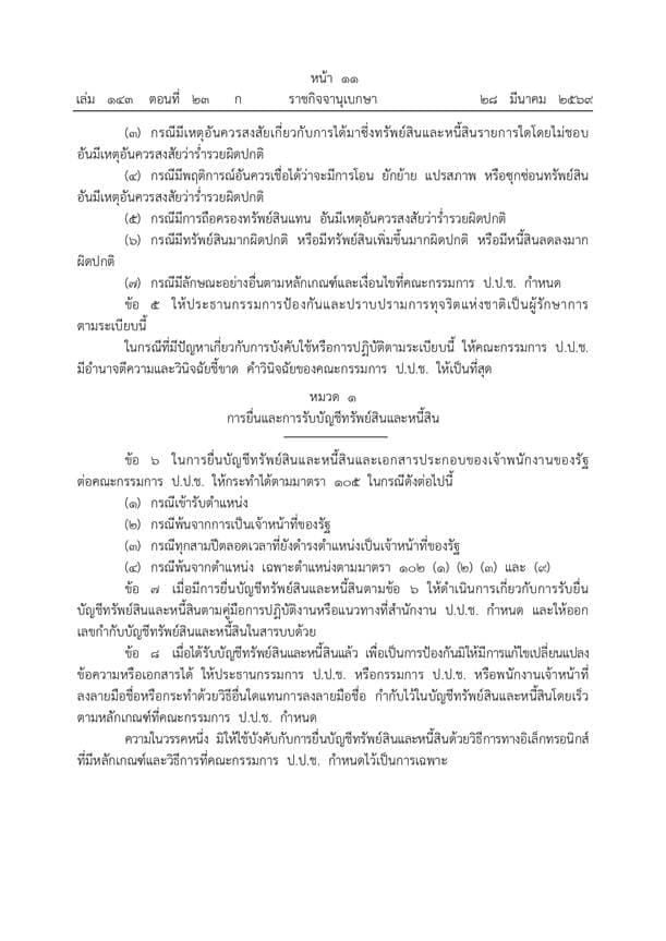 ข้อ 6 กำหนดหน้าที่ของเจ้าพนักงานของรัฐในการยื่นบัญชีทรัพย์สินและหนี้สินพร้อมเอกสารประกอบต่อคณะกรรมการ ป.ป.ช. ในกรณีเข้ารับตำแหน่ง กรณีพ้นจากการเป็นเจ้าหน้าที่ของรัฐ กรณีทุกสามปีตลอดเวลาที่ยังดำรงตำแหน่งเป็นเจ้าหน้าที่ของรัฐ และกรณีพ้นจากตำแหน่งเฉพาะตำแหน่งตามที่กฎหมายกำหนดในมาตรา 102 (1) (2) (3) และ (4) ข้อ 8 ระบุว่าเมื่อได้รับบัญชีทรัพย์สินและหนี้สินแล้ว เพื่อเป็นการป้องกันมิให้มีการแก้ไขเปลี่ยนแปลงข้อความหรือเอกสาร ให้ประธานกรรมการ ป.ป.ช. หรือกรรมการ ป.ป.ช. หรือพนักงานเจ้าหน้าที่ ลงลายมือชื่อหรือกระทำด้วยวิธีอื่นใดแทนการลงลายมือชื่อกำกับไว้ในบัญชีทรัพย์สินและหนี้สินโดยเร็วตามหลักเกณฑ์ที่กำหนด ยกเว้นการยื่นผ่านระบบอิเล็กทรอนิกส์ที่มีหลักเกณฑ์เฉพาะ ข้อ 9 กำหนดให้สำนักงาน ป.ป.ช. ต้องพิจารณาส่งมอบบัญชีและเอกสารประกอบแก่ส่วนราชการภายในที่มีหน้าที่และอำนาจภายใน 15 วันนับแต่ได้รับยื่น