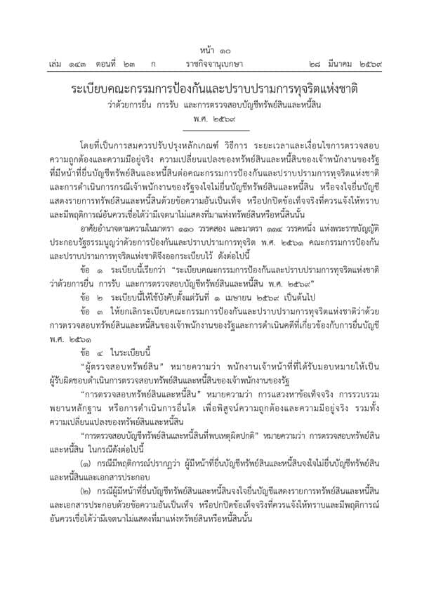 สำนักข่าว Next News รายงานว่า เว็บไซต์ราชกิจจานุเบกษา ประกาศเมื่อวันที่ 28 มีนาคม 2569 เรื่อง ระเบียบคณะกรรมการป้องกันและปราบปรามการทุจริตแห่งชาติ ว่าด้วยการยื่น การรับ และการตรวจสอบบัญชีทรัพย์สินและหนี้สิน พ.ศ. 2569 ซึ่งเป็นการออกระเบียบเพื่อปรับปรุงหลักเกณฑ์ วิธีการ ระยะเวลา และเงื่อนไขในการตรวจสอบความถูกต้องและความมีอยู่จริง รวมถึงความเปลี่ยนแปลงของทรัพย์สินและหนี้สินของเจ้าพนักงานของรัฐให้มีประสิทธิภาพและมีความโปร่งใสสูงสุด