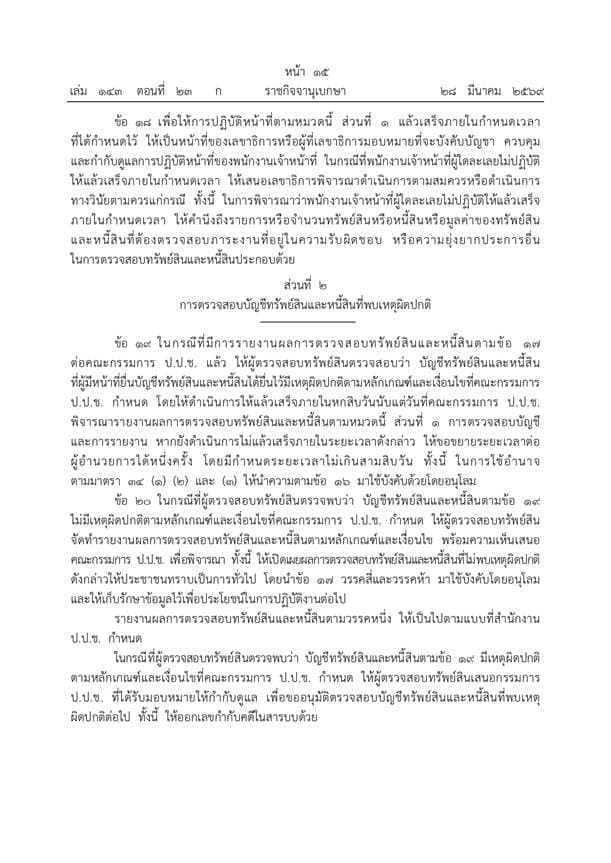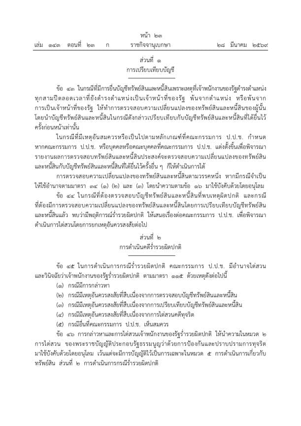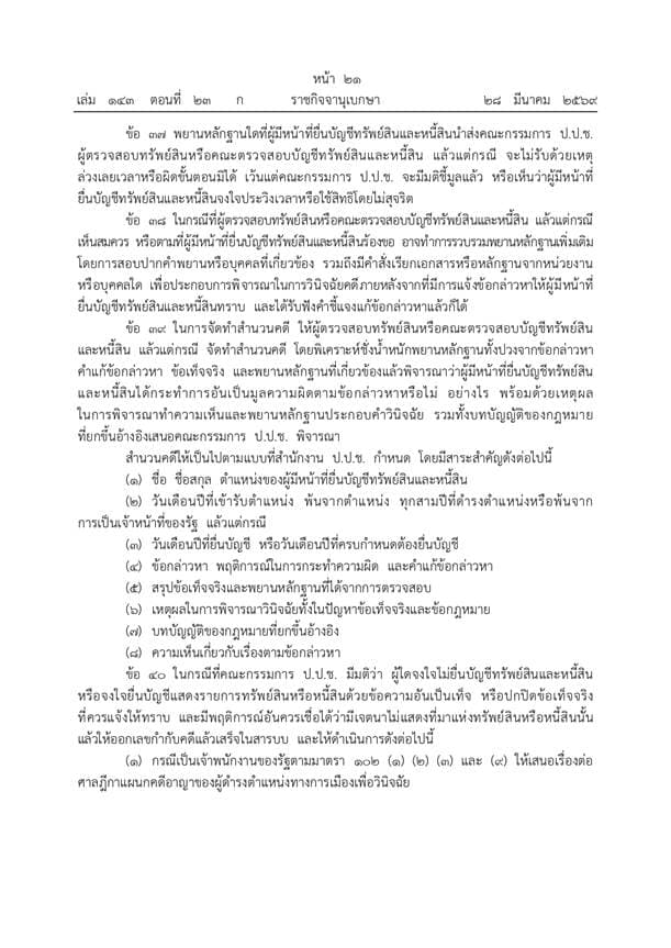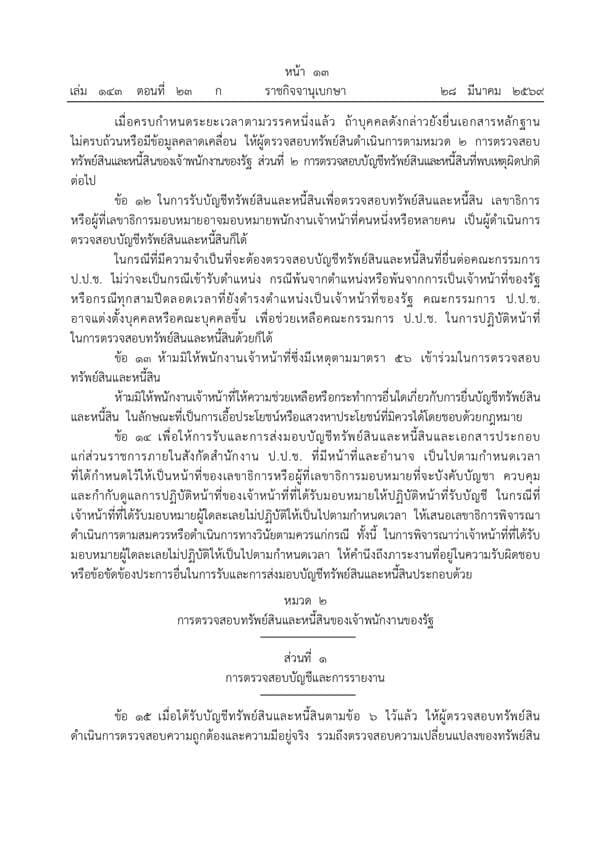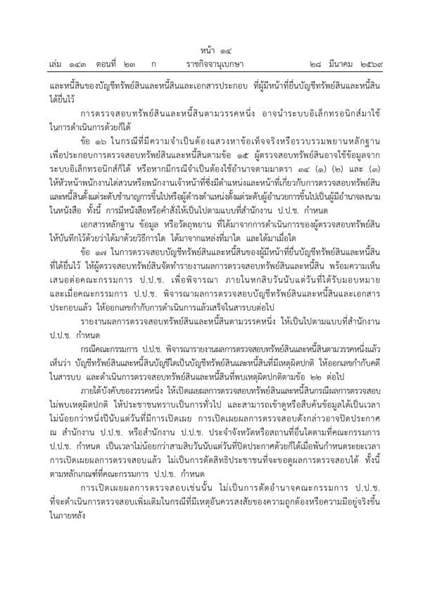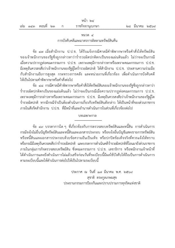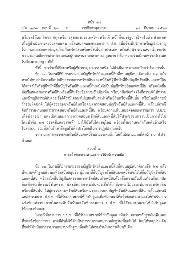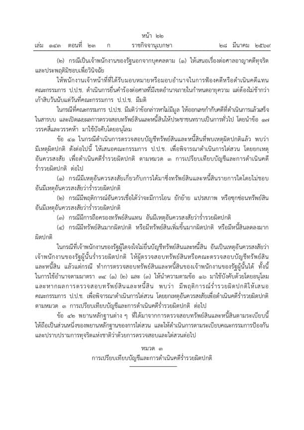 ราชกิจจานุเบกษาประกาศระเบียบ ป.ป.ช. ฉบับใหม่ปี 2569 ยกระดับการตรวจสอบบัญชีทรัพย์สินเจ้าพนักงานของรัฐให้เข้มข้นและครอบคลุมยิ่งขึ้น ดีเดย์เริ่มบังคับใช้ 1 เมษายน 2569 เน้นพิสูจน์ความมีอยู่จริงของทรัพย์สินพร้อมมาตรการเปิดเผยผลการตรวจสอบต่อสาธารณะเพื่อความโปร่งใส ย้ำบทลงโทษหากจงใจปกปิดข้อมูลหรือพบเหตุร่ำรวยผิดปกติ เดินหน้าส่งศาลดำเนินคดีและประสานทุกหน่วยงานเร่งยึดทรัพย์คืนสู่แผ่นดิน