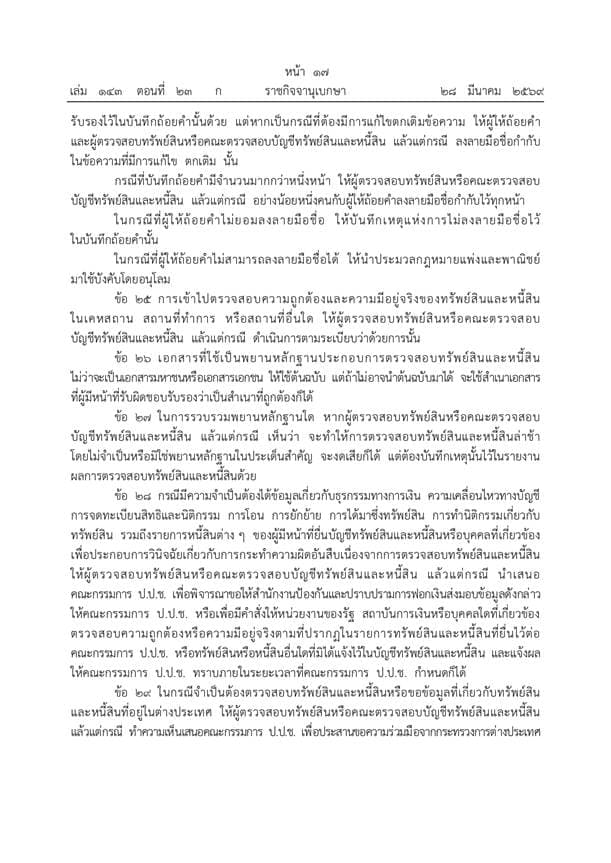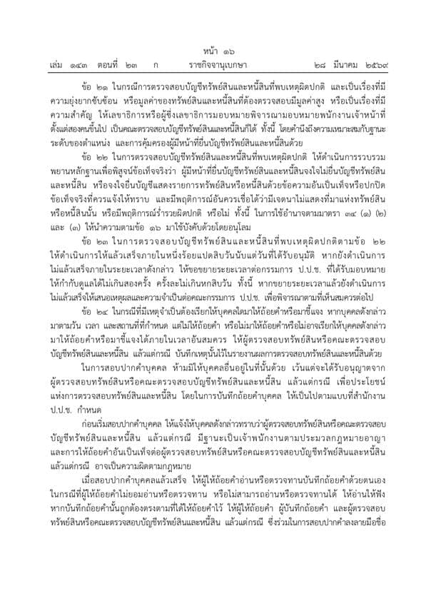 ข้อ 15 มอบหมายให้ผู้ตรวจสอบทรัพย์สินดำเนินการตรวจสอบความถูกต้อง ความมีอยู่จริง และตรวจสอบความเปลี่ยนแปลงของทรัพย์สินและหนี้สิน โดยอาจนำระบบอิเล็กทรอนิกส์มาใช้ในการดำเนินการด้วย, ข้อ 17 กำหนดให้ผู้ตรวจสอบทรัพย์สินจัดทำรายงานผลการตรวจสอบพร้อมความเห็นเสนอต่อคณะกรรมการ ป.ป.ช. ภายใน 60 วันนับแต่วันที่ได้รับมอบหมาย และในกรณีที่ผลการตรวจสอบไม่พบเหตุผิดปกติ ให้เปิดเผยผลการตรวจสอบให้ประชาชนทราบเป็นการทั่วไปและสามารถเข้าดูหรือสืบค้นข้อมูลได้เป็นเวลาไม่น้อยกว่า 1 ปี ข้อ 19 ระบุว่าในกรณีพบเหตุผิดปกติจากการรายงานผลการตรวจสอบ ให้ดำเนินการตรวจสอบให้แล้วเสร็จภายใน 60 วัน และสามารถขอขยายระยะเวลาต่อผู้อำนวยการได้หนึ่งครั้งไม่เกิน 30 วัน ข้อ 23 กำหนดให้การตรวจสอบบัญชีที่พบเหตุผิดปกติต้องดำเนินการให้แล้วเสร็จภายใน 180 วันนับแต่วันที่ได้รับอนุมัติ และขยายระยะเวลาได้ไม่เกินสองครั้ง ครั้งละไม่เกิน 60 วัน